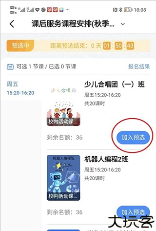 3、把心仪的课程加入预选清单,该课程预选人数未达报名人数上限会在预选结束后自动提交报名,报名阶段无需家长手动报名。