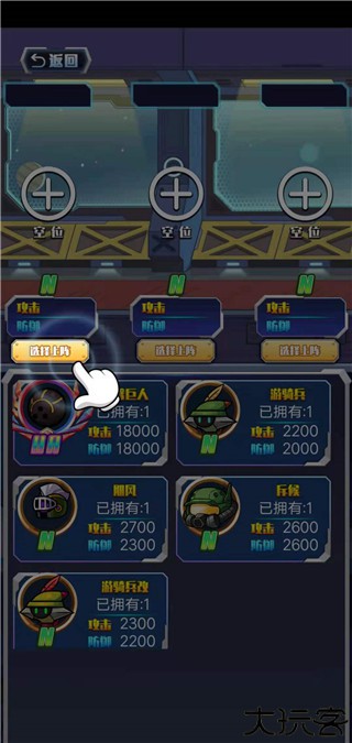 5、将刚刚招募而来的机甲点击上选择上阵。