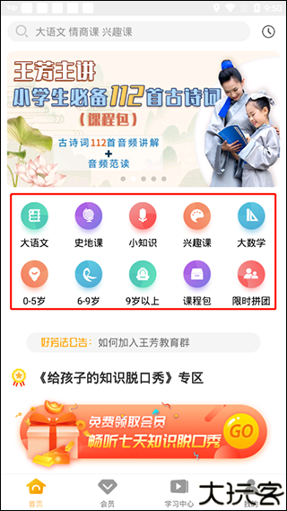 2、界面包含语文、数学、地理及兴趣等多板块课程入口。