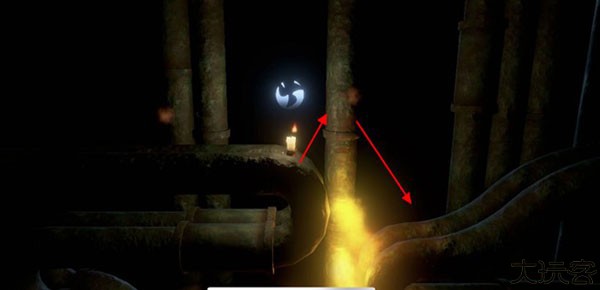 1、第三章第二节打开铁门,如下图操作蜡烛推动螺旋桨即可打开铁门。