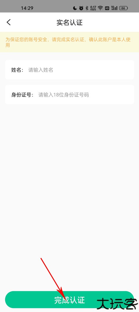 4、进入实名认证页面后,输入正确的姓名和身份证号之后,点击完成就可以了。