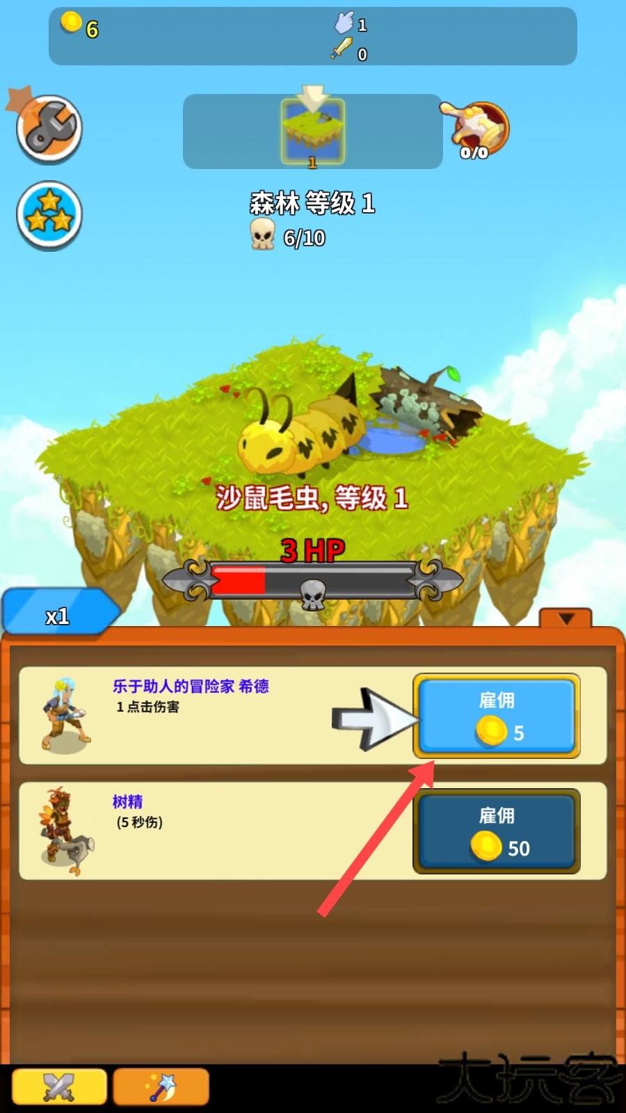 3、使用金币雇佣英雄,提升伤害,赚取更多金币。