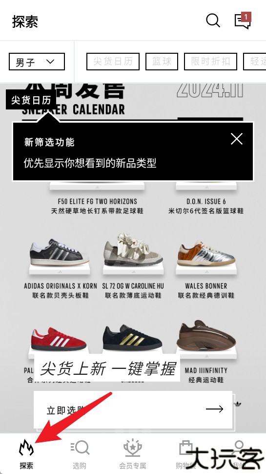 1、点进“探索”查看新品、联名与限量系列,紧跟发售动态。