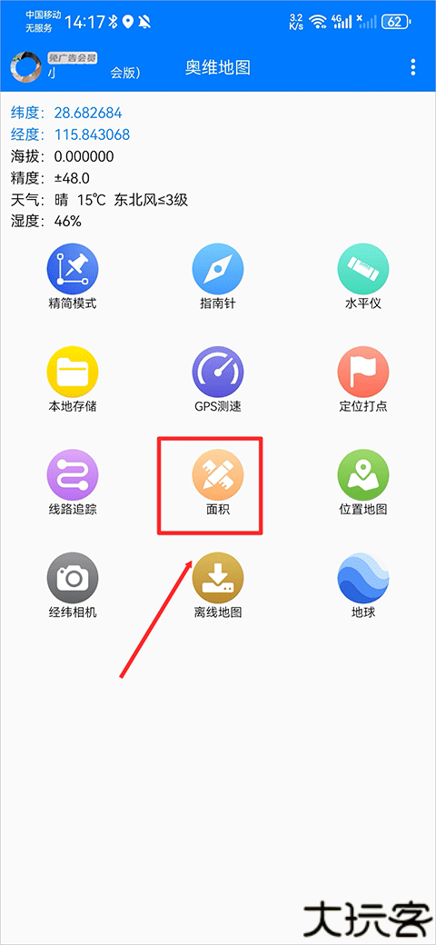 2、在地图旁就会显现出来,点击面积功能。