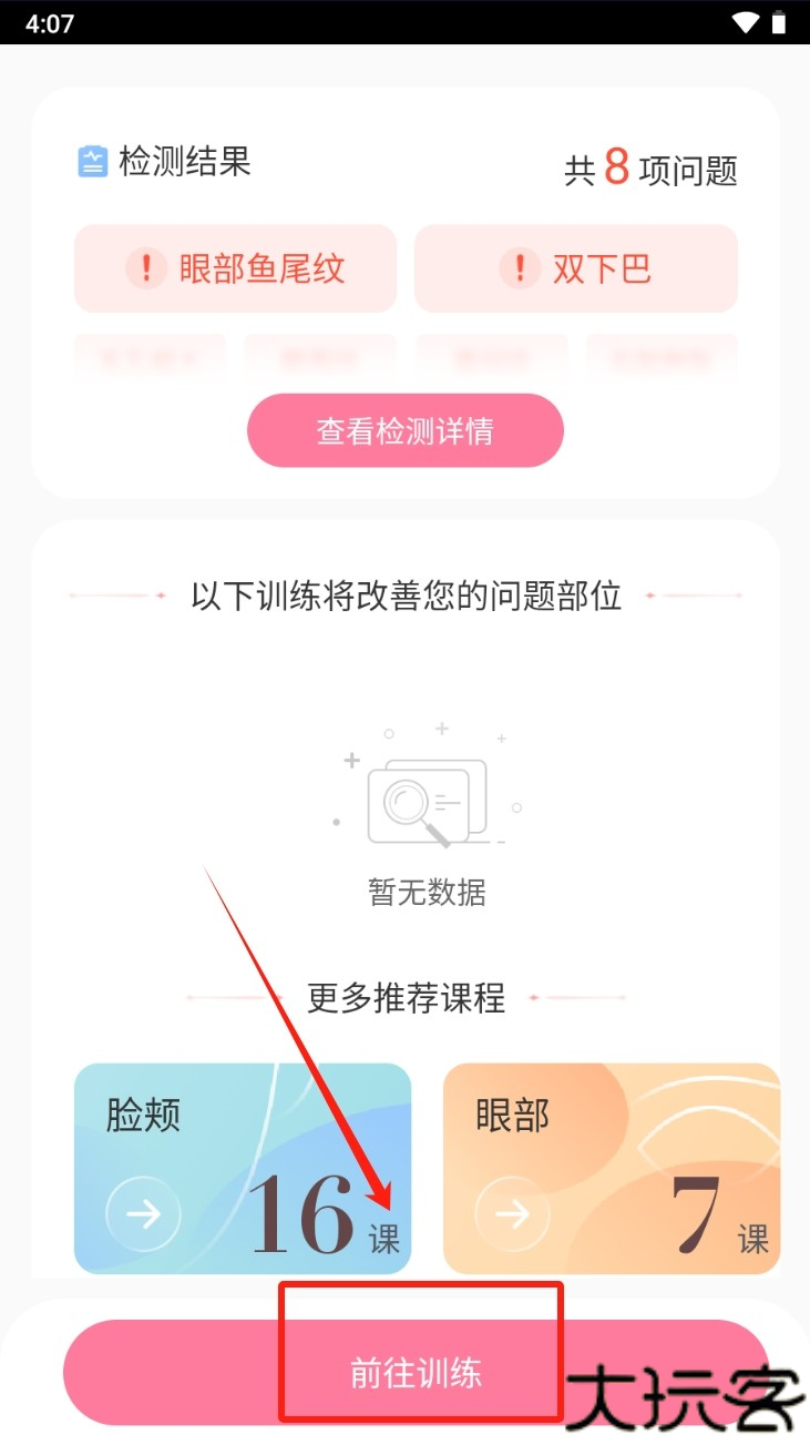 3、这样就可以去查看检测结果,点击“前往训练”开始改善皮肤问题。