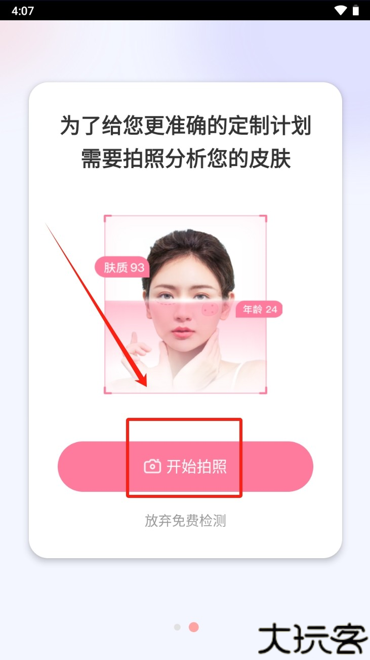2、可以去点击“开始拍照”就能够去上传照片以分析皮肤状况。