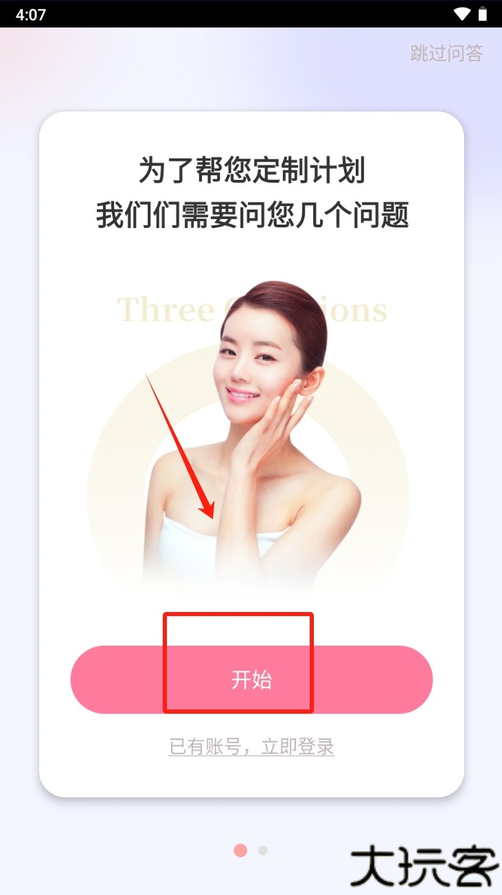 1、打开进入魔镜面部瑜伽软件来去点击“开始”按钮,定制护肤计划。