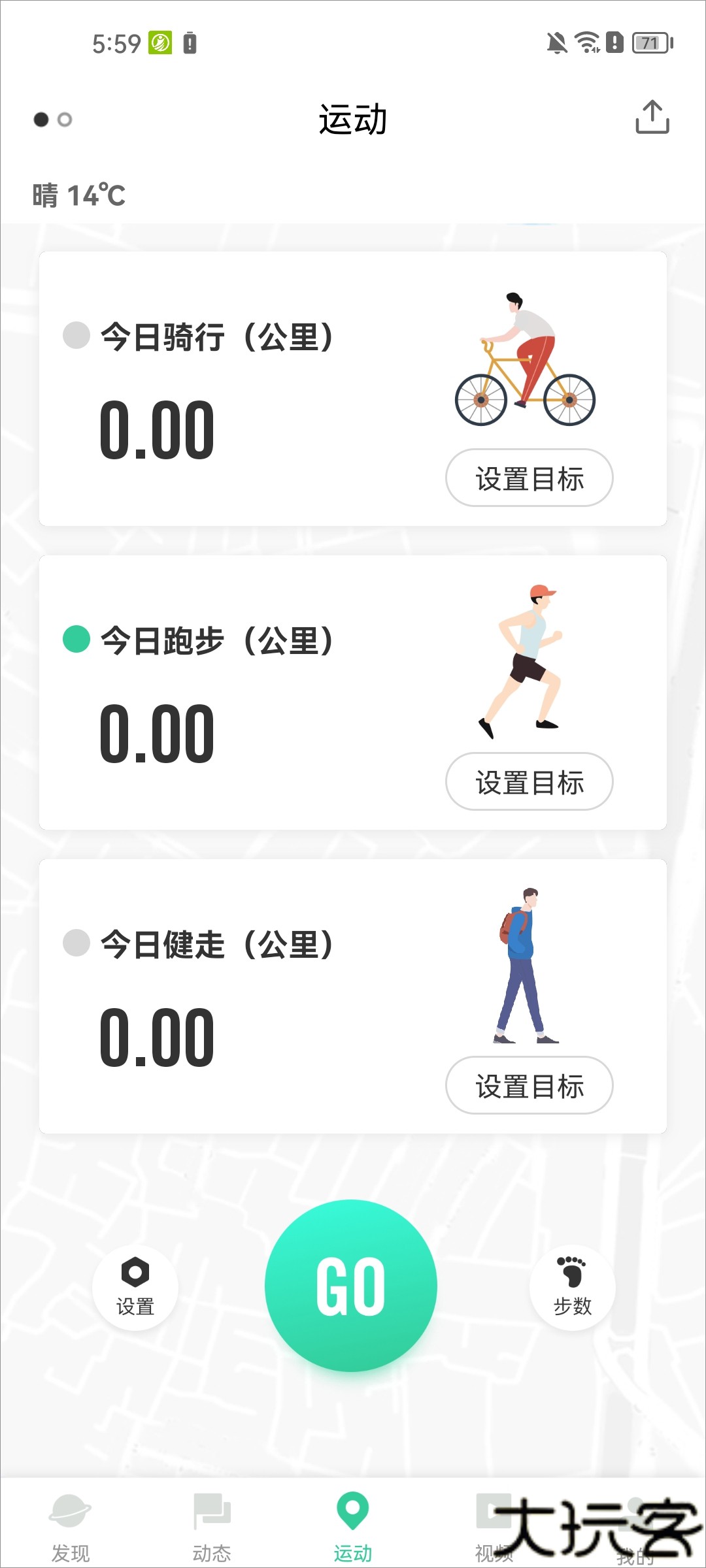 1、打开应用,进入运动页面,点击左下角的设置选项。