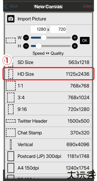 3、选择高清画布开启绘制,不同设备显示的像素和图层数会有所不同。