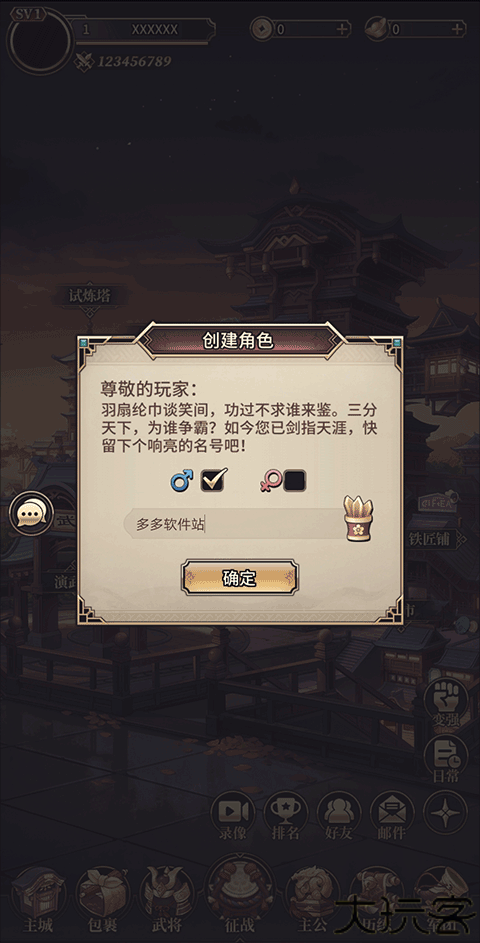 1、进入游戏后,填写角色名并选择人物性别,正式踏上征途。