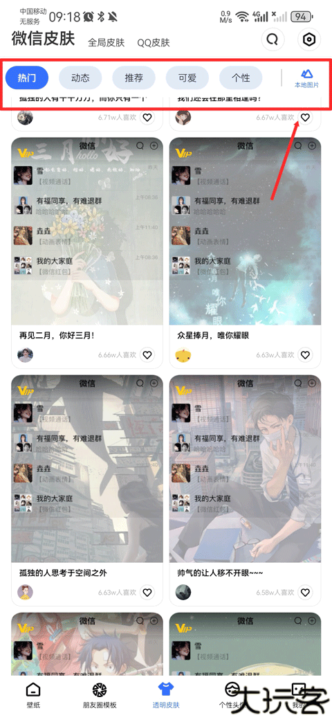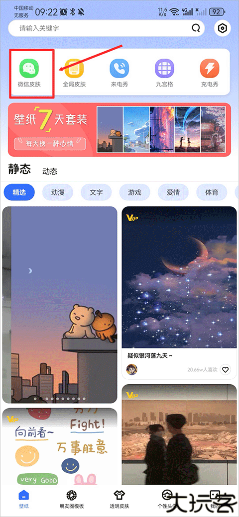 3、也可点击顶部微信皮肤标签,快速访问换肤设置。