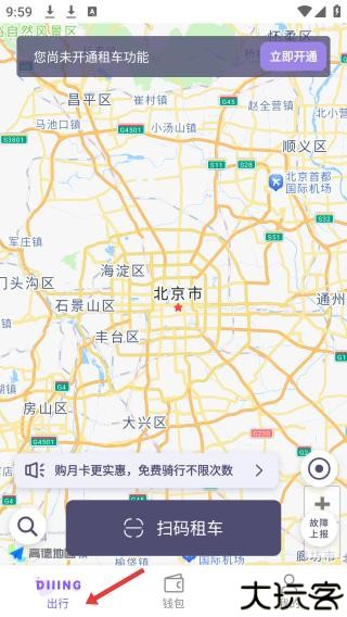 1、打开进入叮达自行车出行里,点击出行呈现地图,提示租车功能待开通,设有扫码租车等功能。