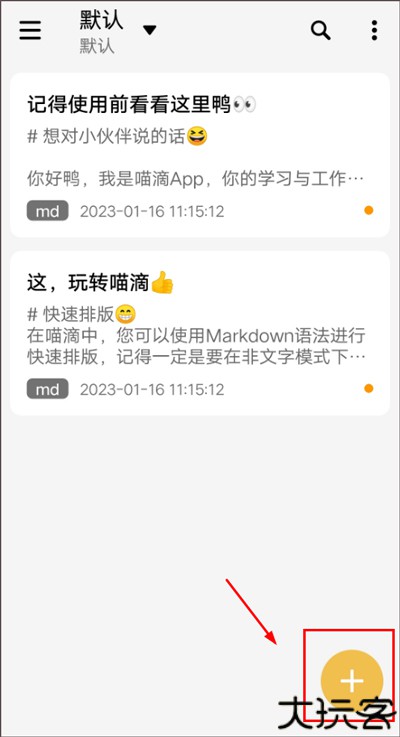 1、登录喵滴APP,首页点击右下角【+】进入新建笔记界面。