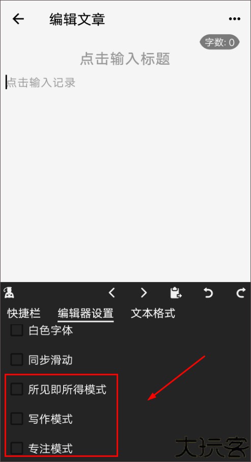 4、进入【编辑器设置】,下拉选择【写作模式】或【专注模式】即可。