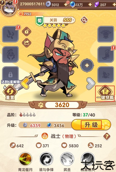 2、武将可升级解锁新技能,并一键配装快速增强战斗力。