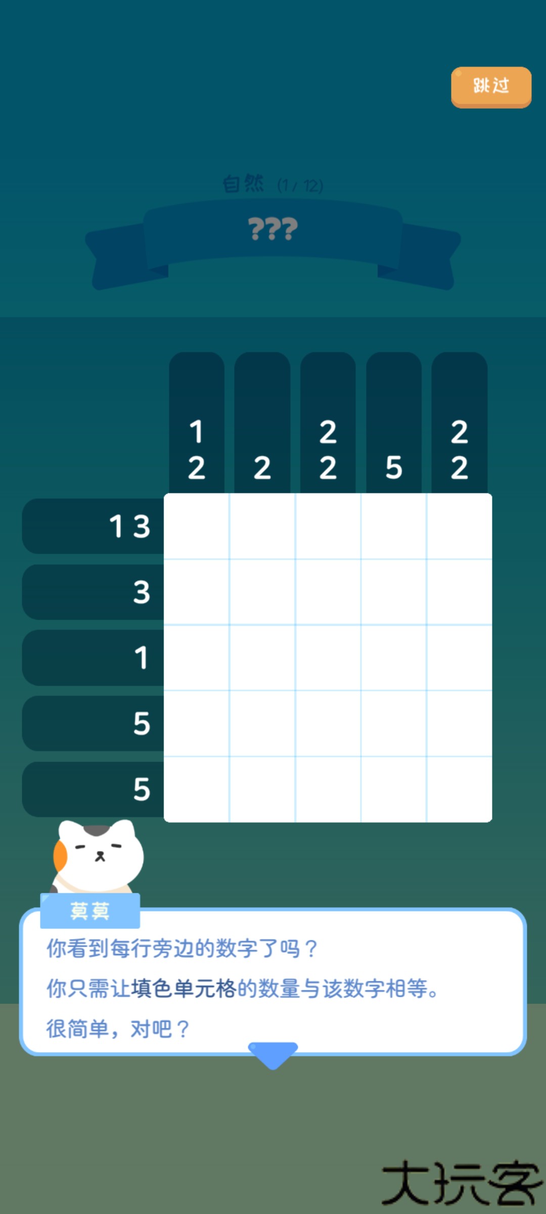 3、观察每一行/列的数字提示,按数量填涂相应格子。
