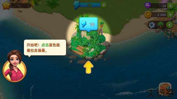 2、接下来跟随小龙的指示,清理掉藤蔓下面的杂草,然后点击蓝色能量拉走藤蔓。