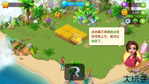 4、在农场里,玩家可以点击麦田,随后点击镰刀将其拖动至农作物上方以完成收割。