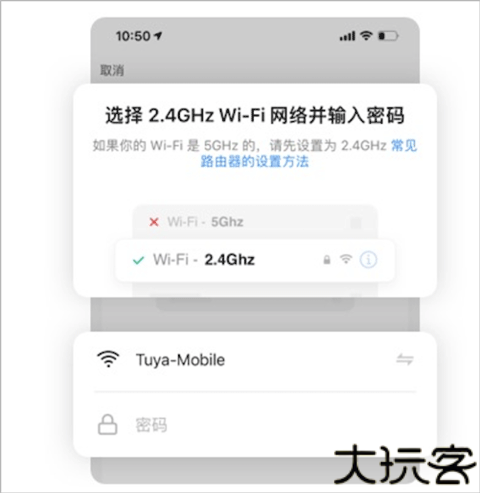 选择家中2.4GHz的Wi-Fi频段,并输入网络名称及密码,让设备连接网络。