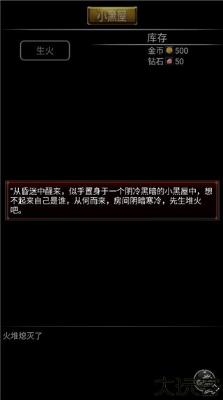 1、进入游戏后作为主角置身于一个阴冷黑暗的小黑屋中,可以先生堆火。