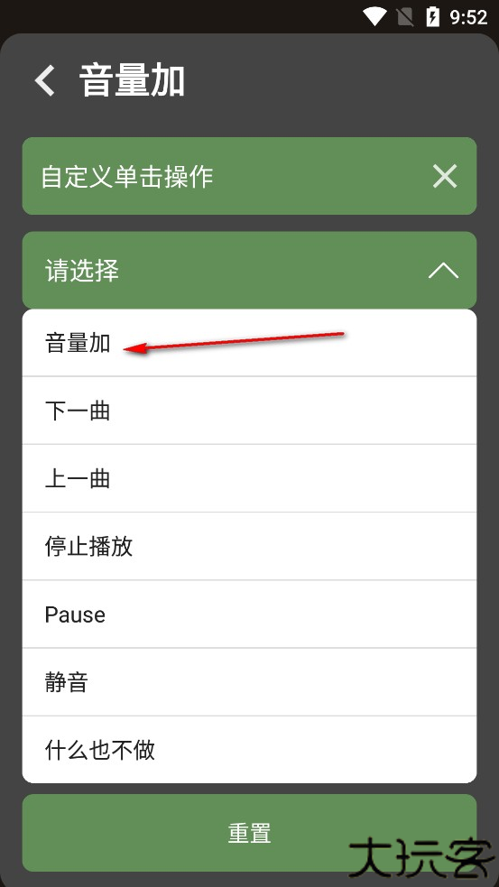 3、挑选所需动作,如【增加音量】作为单击功能。