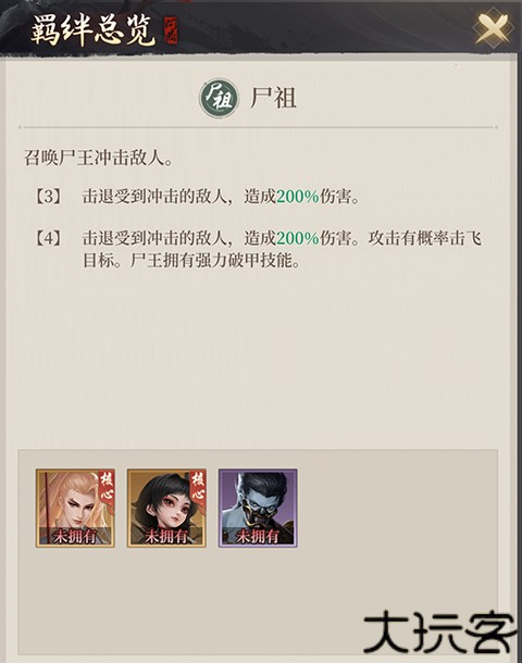 技能效果:能够召唤尸王冲击敌而尸王,是一个极强力的前排坦位,再加上荤勾和焊魅两位战士,可以为召唤流核心的侯卿营造安全输出环境,通过必杀唤尸咒不断召唤鱼戶,完成前排角色数量上和强度上的双重碾压。