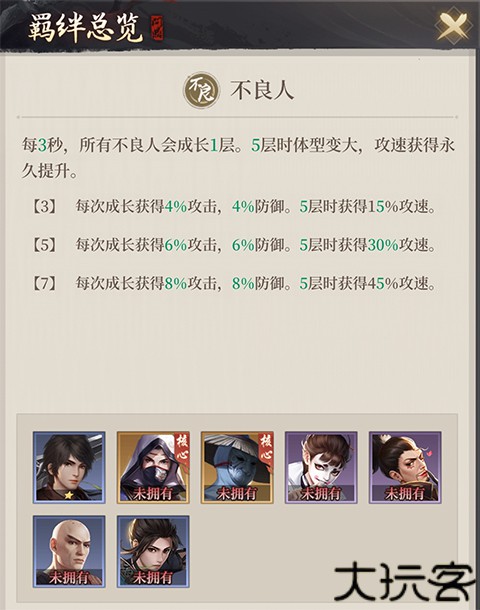 2、技能效果:随着战斗时间叠加,不断提升全体不良人阵营人物的攻击、防御和攻速、且体型变大、加成属性在本场战斗中永久生效。这让不良人阵营的侠客,拥有在后期质变的可能,一些本来定位不是输出位的不良人,在阵营效果的叠加下会打出惊人的输出效果。