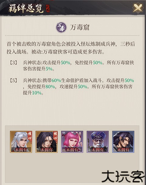 2、技能效果:提升万毒盒侠客造成的伤害,同时首个被击败的万毒宜侠客会被投入怪坛炼制成兵神并重返战场,算是一种复活返场加强。有了这效果的存在,万毒侠客缺少前排的弱点就会被弥补,从而可以专心提高伤害。尤其是万毒侠客尤川,作为一个神行职业侠客,复活返场后,切后排将更加行云流水。