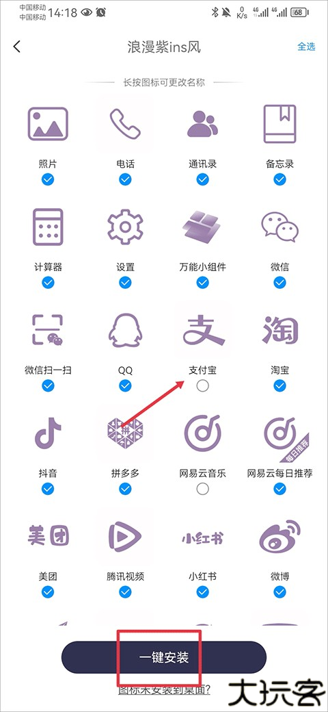 3、点击一键安装,可以选择取消勾选不想替换的图标。