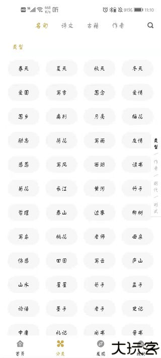 2、点击分类,可快速按诗文类型筛选内容,方便查找目标。