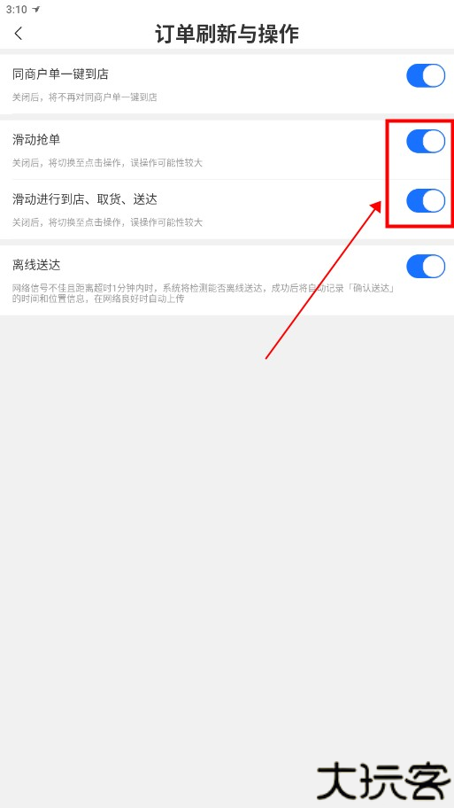 4、可以将“滑动抢单”与“滑动进行到店、取货、送达”两个都打开,可以更快的实现抢单。