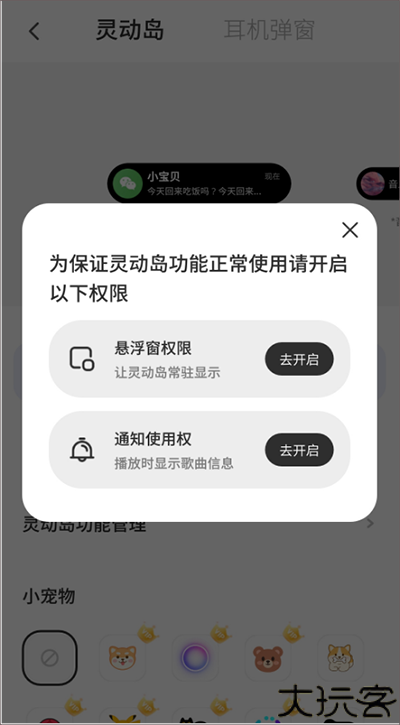 3、但为了保证灵动岛的功能正常使用,请用户开启以下权限,【悬浮窗权限】和【通知使用权】。