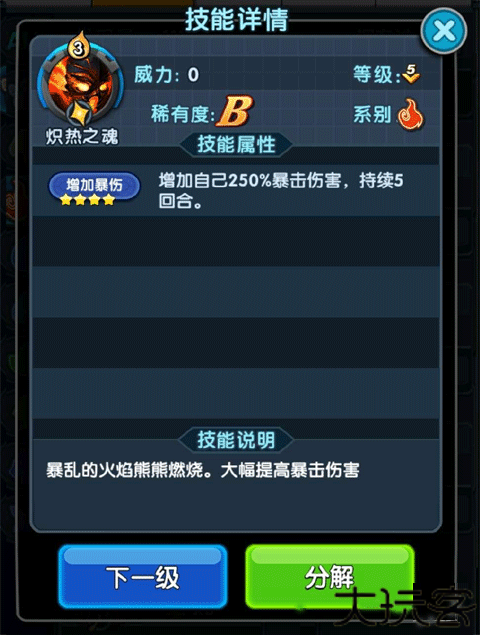 4、炙热之魂会增加暴伤250%,并且持续5回合。这让火神拥有如此高的暴击率,增加暴伤也是必要的,最适合的一个技能则是炙热之魂。地狱翻滚那种1费的技能的暴击套子相比,3费+5费的配置更加高费,所以玩家还是要在阵容配置上有点讲究。