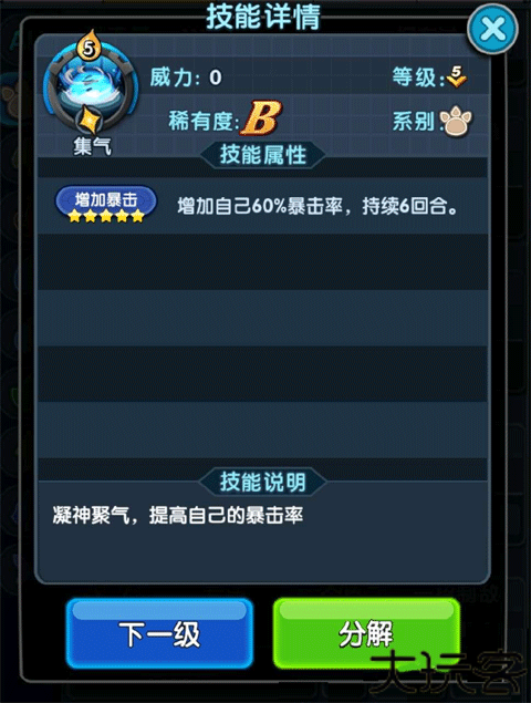 3、随后选择主动技能,第一个集气,能增加60%暴击率并持续6回合,因为伊芙利特的暴击率配合被动能够再上一个阶层。最高可达60%(集气)+12%(潜力树)+8%(火领主)=80%