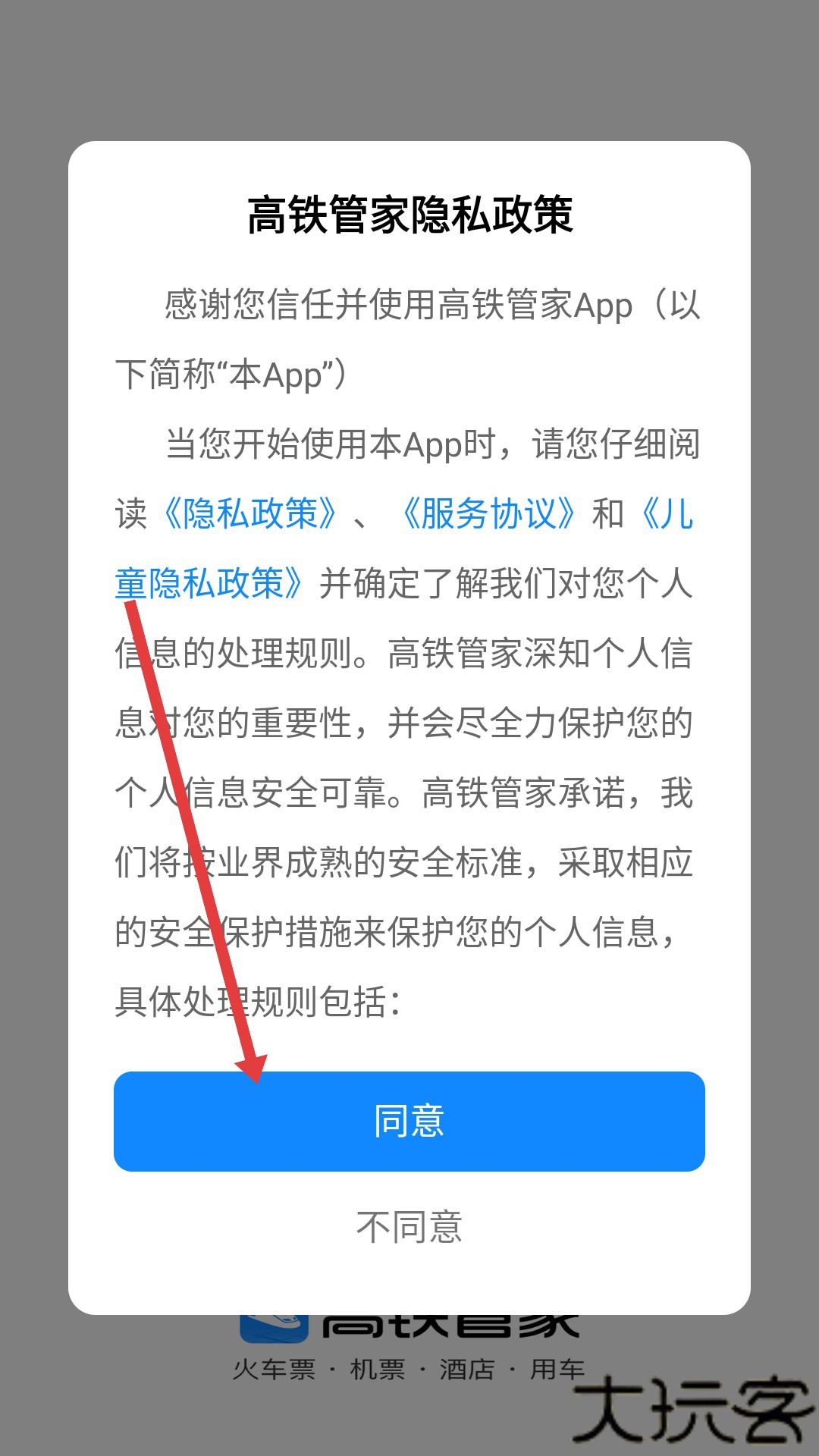 1、打开高铁管家app安卓版进入后,需在用户协议和隐私政策界面点击同意,接受相关条款后才能进入。