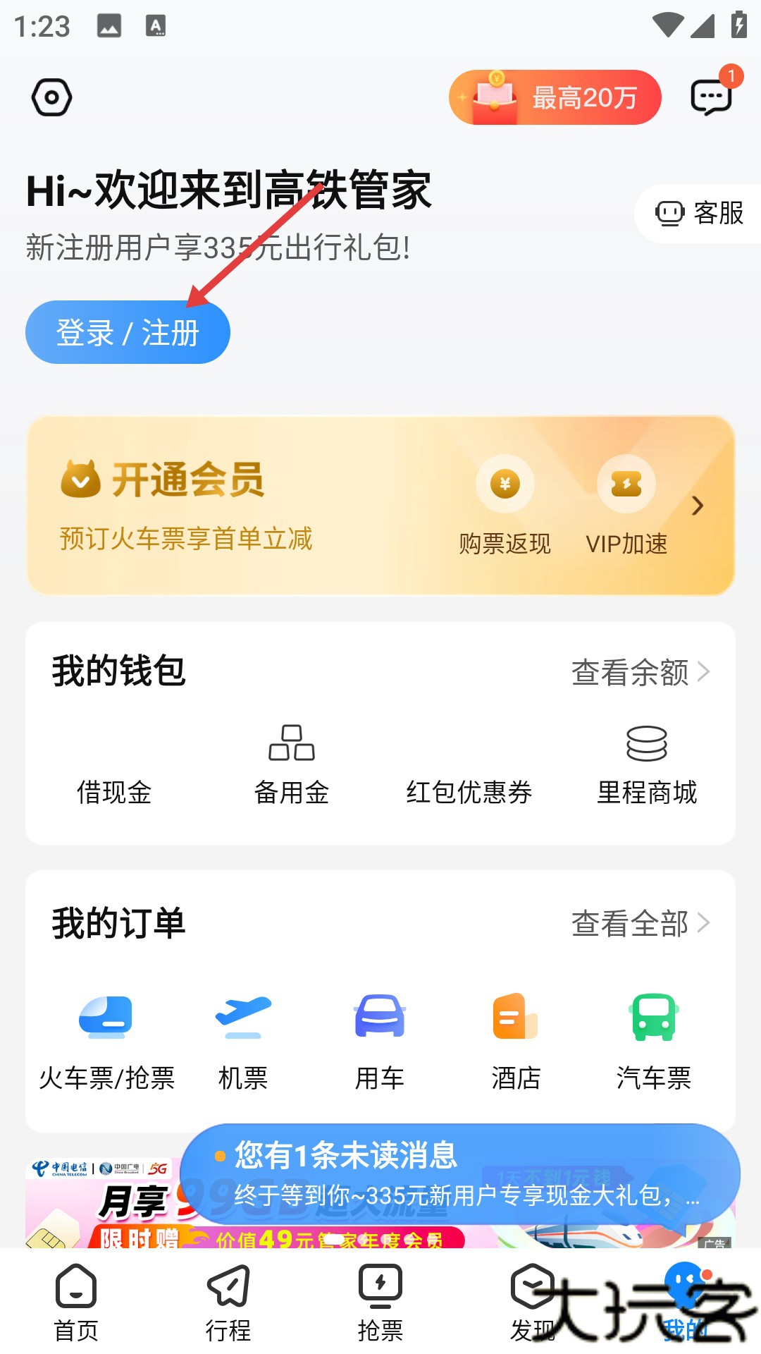 2、在界面里就能够看到有着各种的功能,方便管理出行消费及票务。在去点击登录注册进入新的页面。