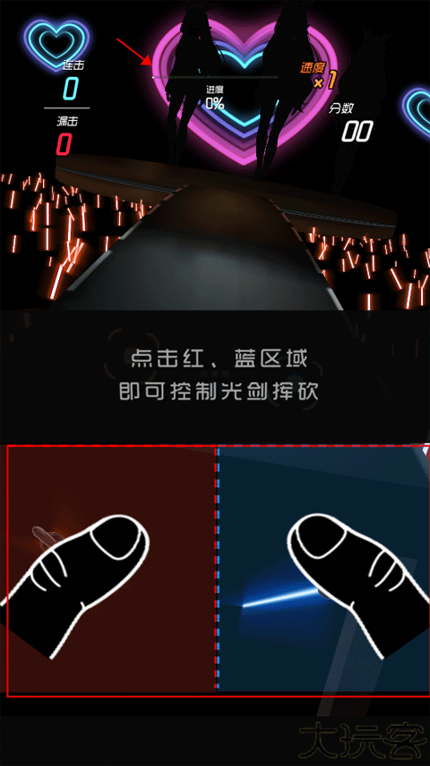 1、打开游戏,会有一段练习的过程,这段练习是帮助你快速上手这款游戏的,游戏玩法非常简单,就是随着音乐的节奏,不断地切割音符块。玩家只需要点击红、蓝区域,即可控制光剑挥砍。