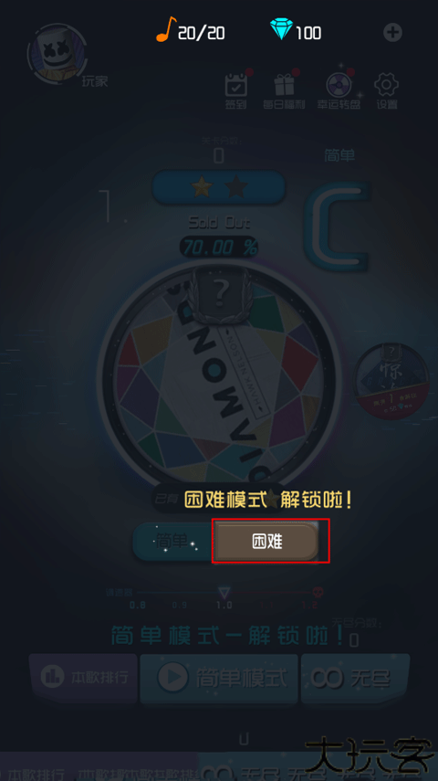 4、这时提示困难模式已经解锁了,点击“困难”按钮即可快速解锁。