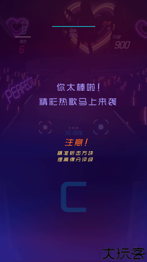 3、当结束这段练习之后,就会正式进入到游戏主界面了。需要注意的是:精准斩击方块,提高得分评级。