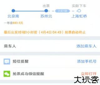 5、用户记得将短信开启,这样就不会错过漏下余票的通知,然后点按蓝字添上乘车人。