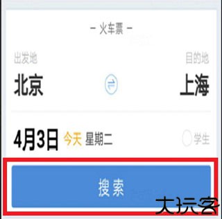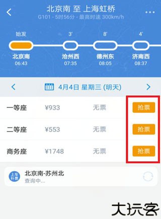 3、选定座等席后,用户点击后方黄格中的“抢票”文字,即使直达的无票,用户可以点蓝钮中的“上车补票”。