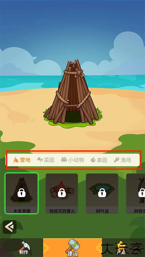 7、在建设栏目,玩家可以建设自己的营地,包括菜园、小动物、果园和渔场。