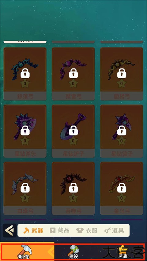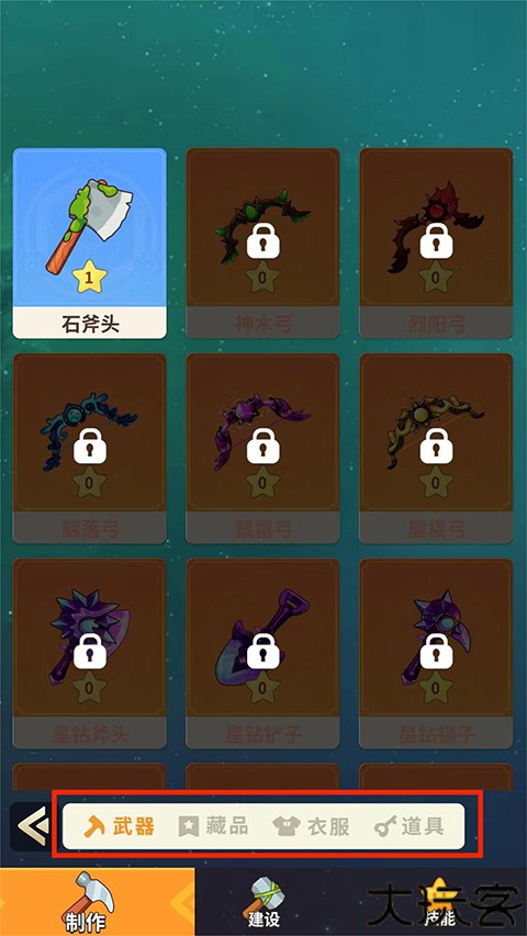 6、在制作栏目,玩家可查看自己已拥有和尚未拥有的武器、藏品、衣服和道具,还可以进行升级。