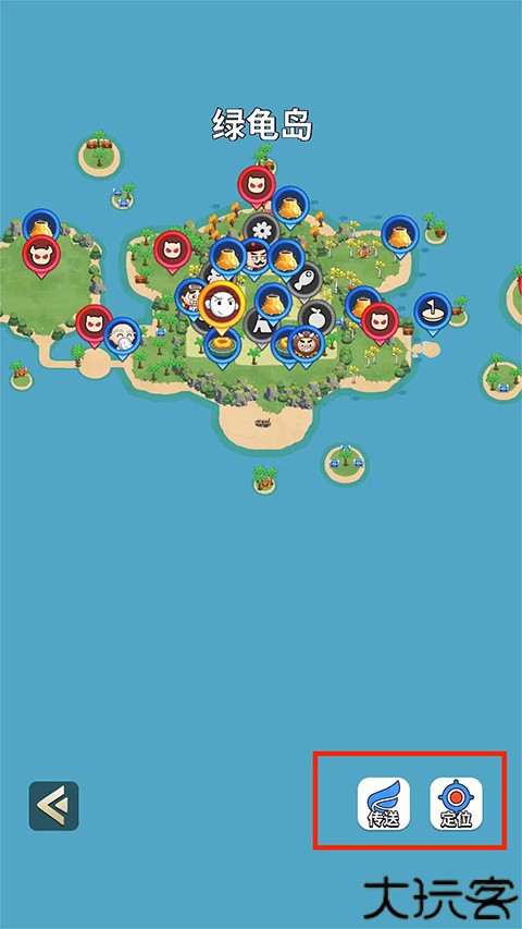 2、进入地图界面,玩家可俯瞰整个绿龟岛,可根据自身需要选择【传送】或者【定位】。
