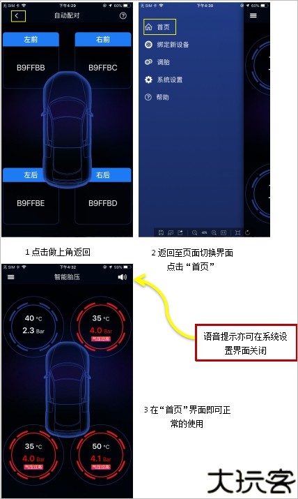 3. 实时显示车辆的四轮胎压与温度信息,同时会标示传感器电量偏低状态。