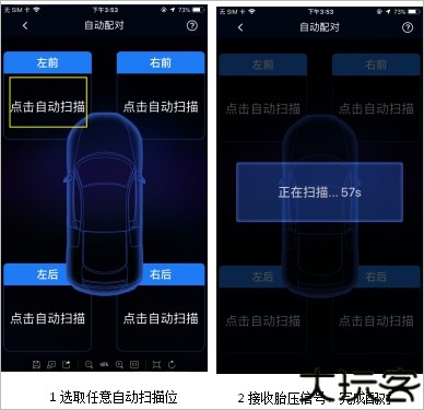 3、选择自动配对时,用户装配好胎压后,在自动配对界面点击任意胎压,软件会在60秒内搜索身边胎压发出匹配的蓝牙信号即可配对成功。