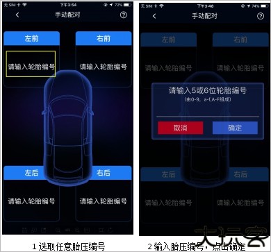 2、选择手动配对时,当用户装配好胎压后,在手动配对界面,选取对应胎压并输入胎压编号后点击确定即可。