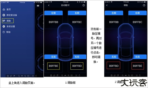 4、成功绑定设备后,安装到轮胎上的编号可能会出现对应错误,用户可以点击“调胎”,点击需要对调的轮胎编号即可对调。
