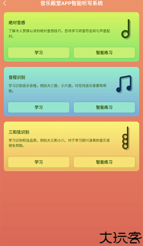 5、用户通过点击首页的智能听写系统可以对乐感、音程、三和弦的三方面进行学习和练习,帮助用户更快的成长。