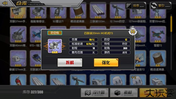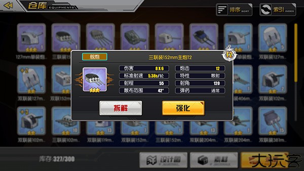 舰炮区分射速与弹道类型,标注如4x3即为每轮3发,每发基础伤害4。